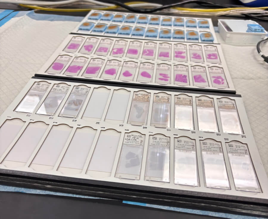 Very thin slices of brain tissue are seen on slides at the UT Health San Antonio Brain Bank. During a BioMed SA BioFest Days event April 7, guests were invited on a tour of the laboratory at the South Texas Research Facility.