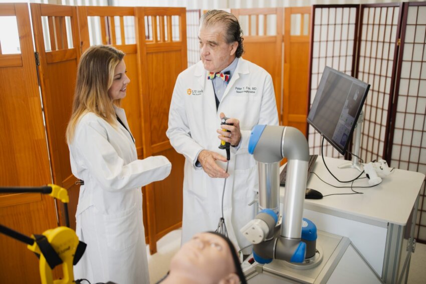 Peter T. Fox, MD, demonstrates a current model of his patented MRI-guided, robotic-controlled navigated TMS delivery system, like the one used in a recent study to significantly reduce symptoms of combat PTSD, in addition to psychotherapy.